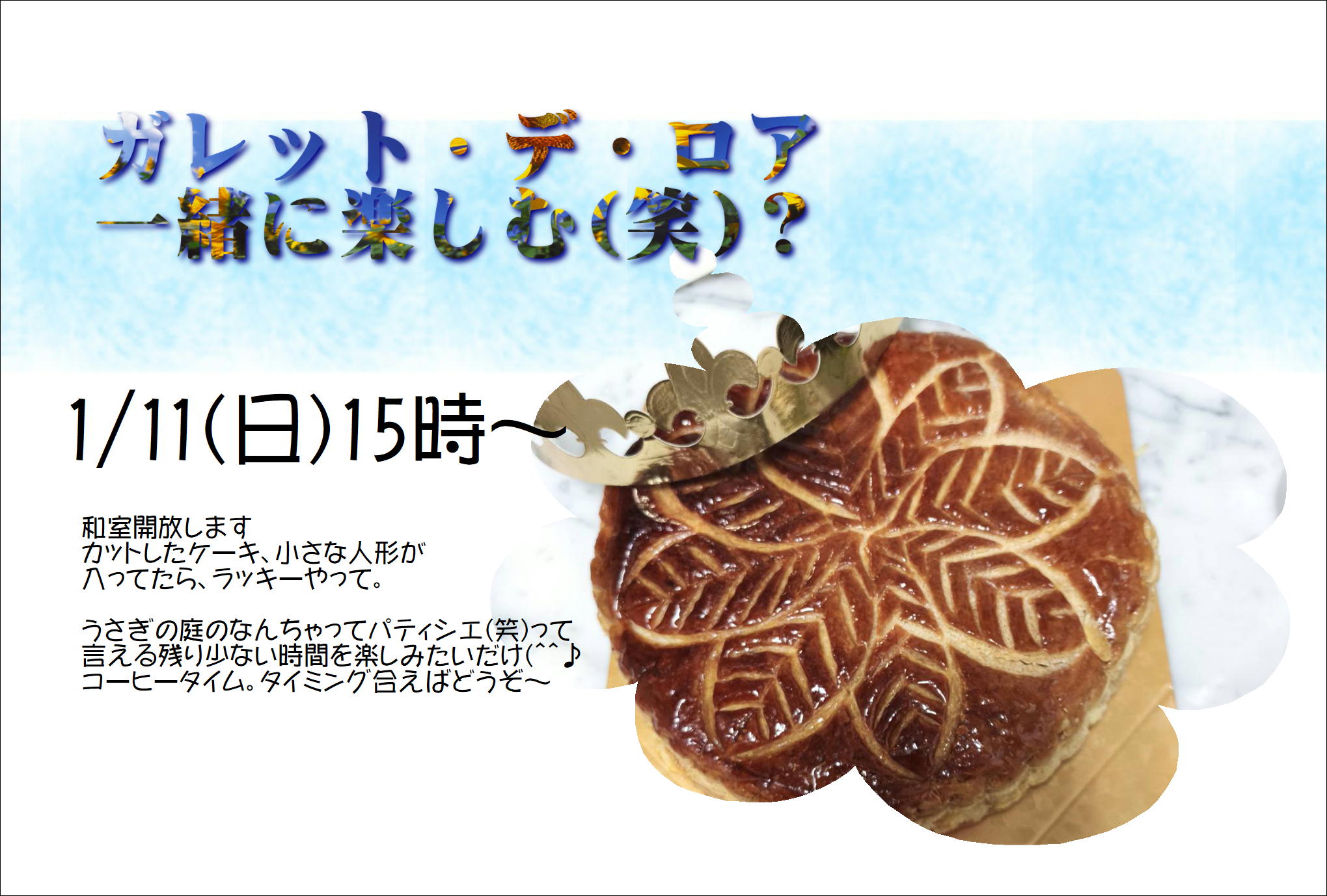 急遽、告知。成人式に出席するために実家に帰ってきた息子。実習で作ったと持って帰ってきたのが、「ガレットデロア」ケーキの中に小さい人形が入ってて、切り分けて食べたとき、その人形が入ってた人が、大吉⁉みたいな感じ(^^;)。そんなんみんなでやったら方が面白いやん!!と、告知(笑)。