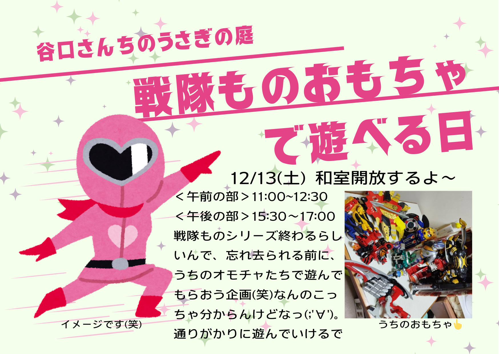 12月13日「和室開放、戦隊ものおもちゃで遊べる日」 投稿 2025.12.07 もう訳分からんお誘いやけど(^^;)。戦隊ものシリーズが終わるということで…。ここから先の子ども達は、「戦隊もの?何ソレ?」っていうんやろ。じゃぁ、その前に分かってもらえてるうちに、うちのおもちゃで遊んでもらおうという思いつき(笑)!!!。誰か来るか知らんけど。私が面白いからいうてみる~~~~。